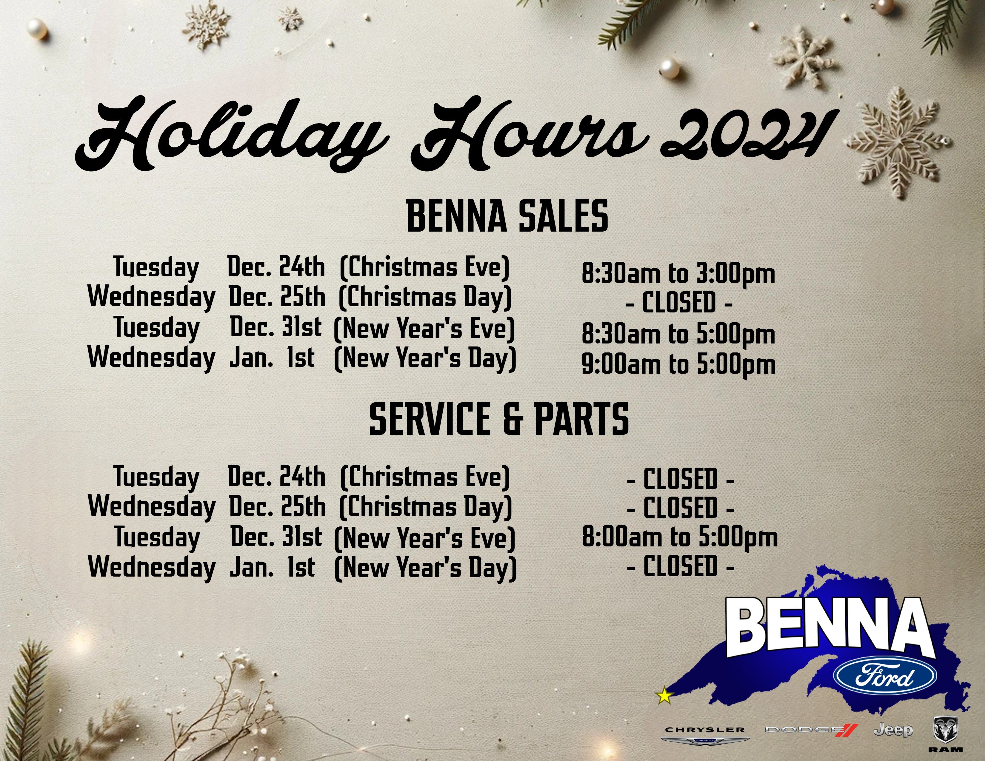 Benna Ford Holiday Hours 2024