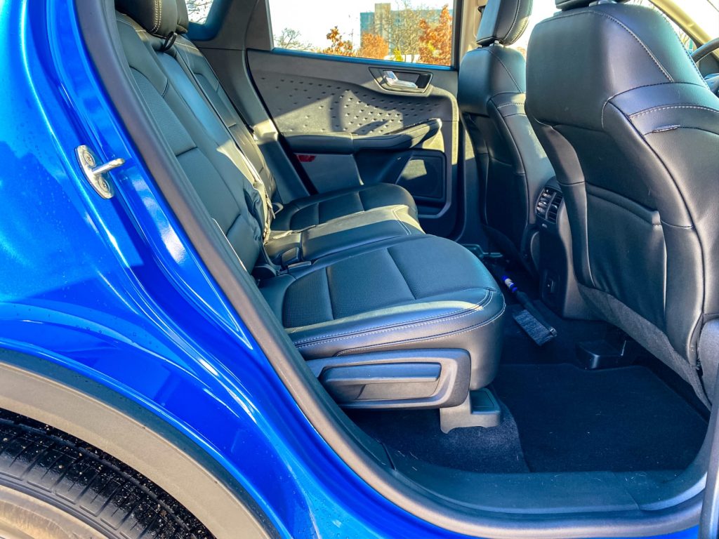 There’s plenty of room in the back seat, and with the ability to slide the seat back, even people taller than six feet have enough room to be comfortable. If what you’re needing is cargo space, the Escape Hybrid AWD definitely has that — even with the rear seat up, it can fit four sets of golf clubs. Fold the rear seats down and you’ve got even more space to haul your stuff.